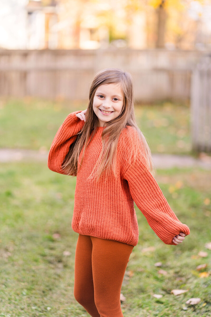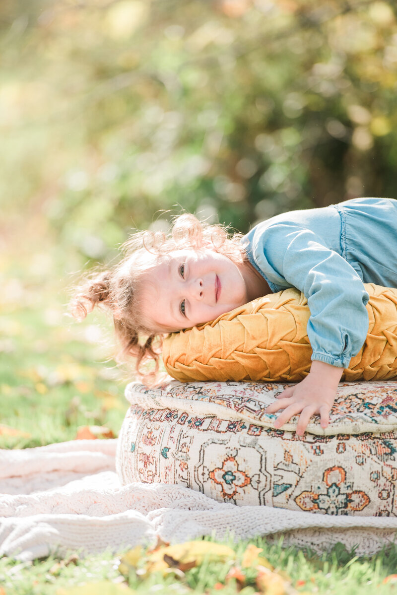If your session takes place in the fall, while it might be tempting to dress your little one in a pumpkin costume to eternally remember the cuteness that babies in costumes in giant piles of leaves holds, I advise keeping attire a little more neutral.